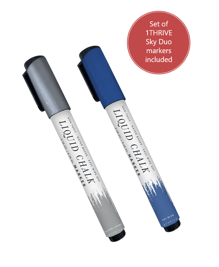 Each systems comes with a set of 2 non toxic liquid chalk markers in silver & sky blue